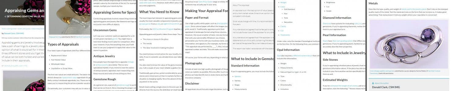 The first two values are retail amounts. The latter two are variations of wholesale rates. You’ll almost always do replacement value appraisals for gem and jewelry owners and consumers. You’ll likely conduct wholesale appraisals, too. These are done in a similar manner. Of course, in these cases you’re researching the prices a jeweler would expect to pay.