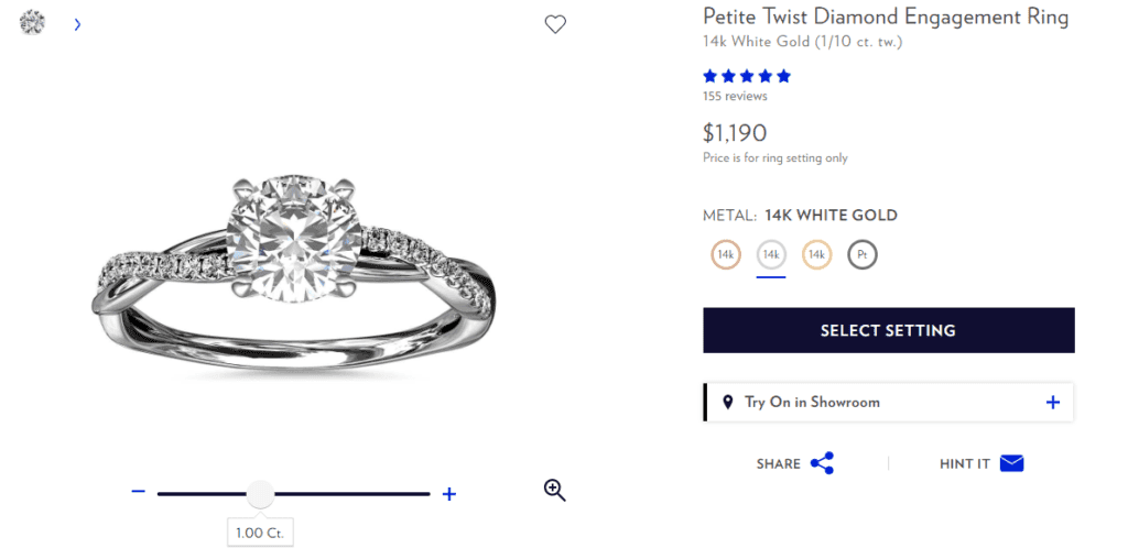Just like James Allen and other retailers that let you build your own engagement ring, Blue Nile remembers your search settings, even if you step away from the computer for a day or two. Keep that in mind as you bounce back and forth between settings, metals, and stones, and check the finished product carefully before you buy it. Otherwise, you could end up with a stone, metal, or setting from a previous search.