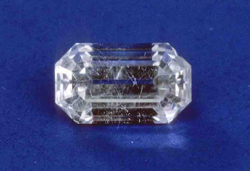 This large, eye-clean, custom shield-cut colemanite displays the facet doubling effect very nicely. 9.33 cts, 14 x 12.1 mm, Boron, California. © The Gem Trader. Used with permission.