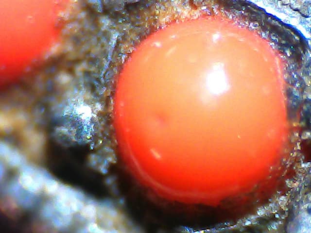 In the 1970s, Pierre Gilson developed "created corals" to help protect the natural variety from destructive harvesting. This imitation red and pink coral has a specific gravity (SG) of 2.44. This is always lower than natural red and pink material. This synthetic has weak birefringence and lacks natural structure. Under high magnification, you can see a fine granular texture.