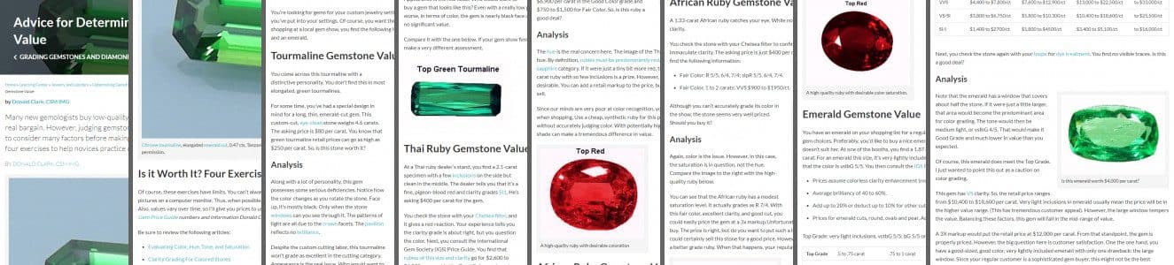 Of course, these exercises have limits. You can’t always accurately judge gem colors through pictures on a computer monitor. Thus, when possible, I’ll give you image comparisons to work with. Also, values vary over time, so I’ll give you prices to use for each exercise. (Editor’s note: the IGS Gem Price Guide numbers and information Donald Clark quotes are based on 2016 values).