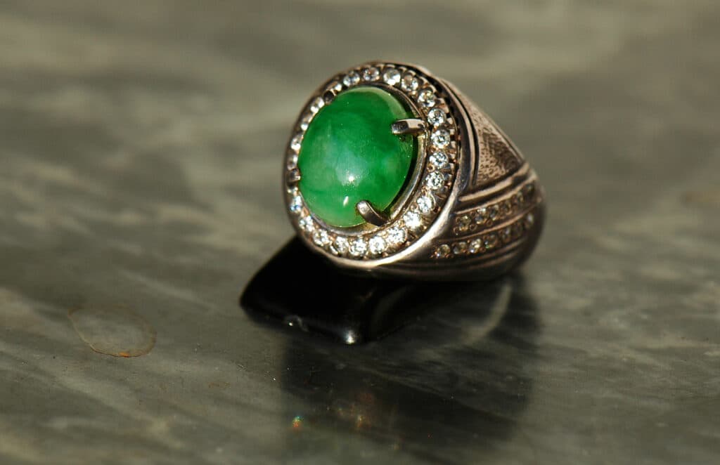 Gems that are semi-transparent to translucent will often be carved into a cabochon and set into a mounting with a closed back which might have a small opening in the center. Light travels through the jadeite and reflects off the metal of the flat mounting, illuminating the gem from the back. This makes stones appear brighter. You will also see lots of beads and flat carvings worn as pendants. All of these shapes encourage light to enter the gem and show off that prized transparency.