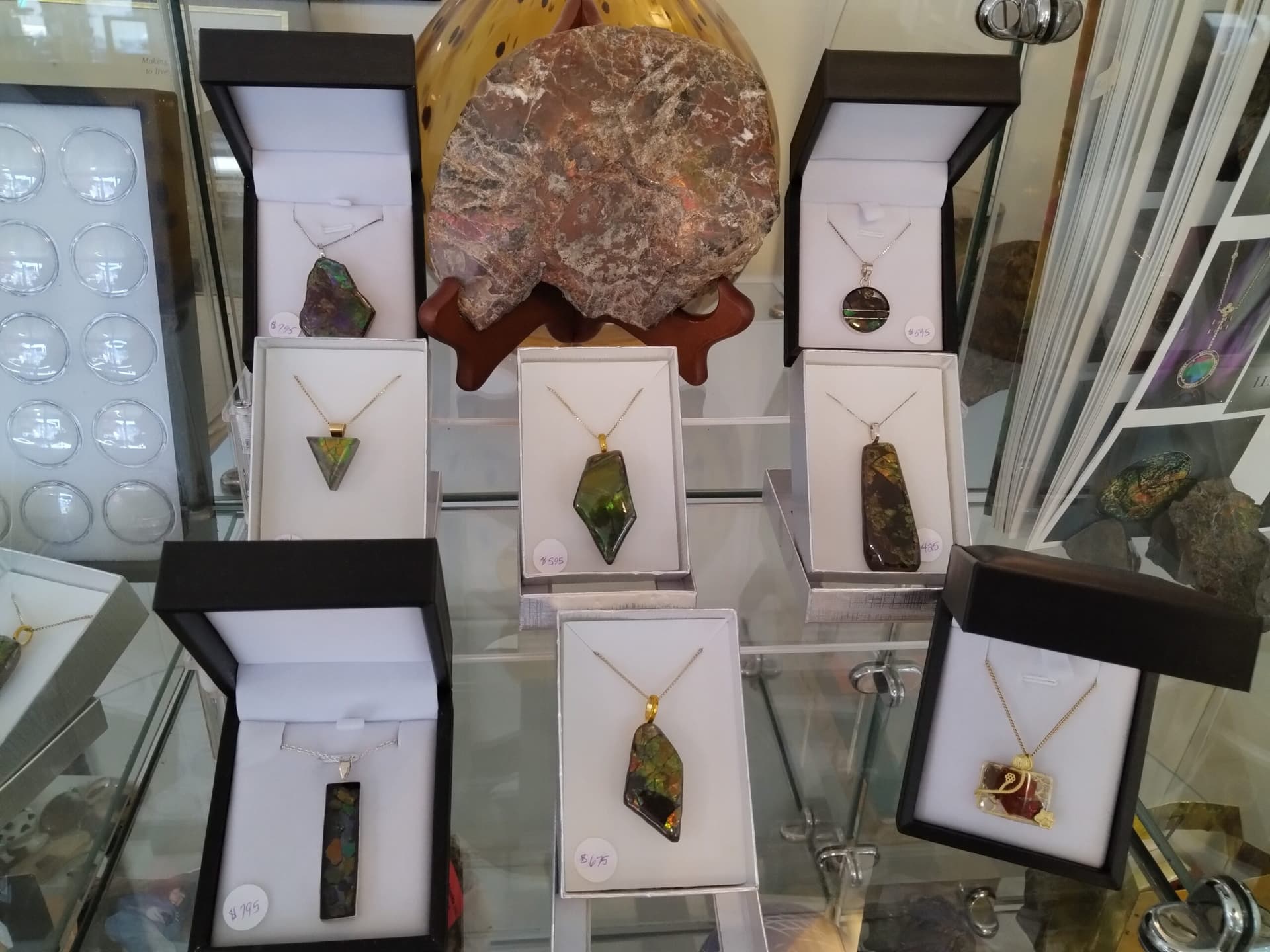 Get ready to be wowed! Diggin Dogs Mining and Jewelry is a very unique Rock and Gem Shop that carries a world class collection of rocks, crystals, agates, unusual gems and a fabulous selection of 1970's Vintage Stock. We also own/operate an Oregon Sunstone Mine and have Beautiful cut gems as well as jewelry. However, our most prized possession is Rare Vintage Canadian Ammolite, and we honor it by making Gorgeous Custom Jewelry and gems, as well as Artistic Specimens. This Ammolite came from Canada in the 1970's prior to it becoming a Precious Gemstone in 1981, so it is not only unique but the colors are magnificent. Considered The Biggest Little Rock Shop on the Coast!