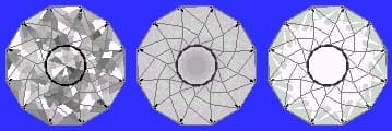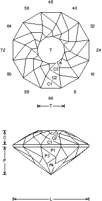 Details and information on Faceting Designs. A Faceting Design Diagram by Jeff R. Graham that presents various cuts and facets suitable for different gems.