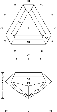Detailed information and guide on Faceting Designs. A Faceting Design Diagram by Jeff R. Graham that presents various cuts, this one is called "3-Triangle".