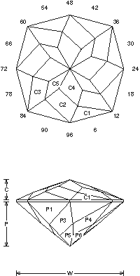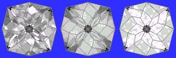 Information and guide on Faceting Designs. A Faceting Design Diagram by Jeff R. Graham that presents various cuts, this one is called "Antique Round About".