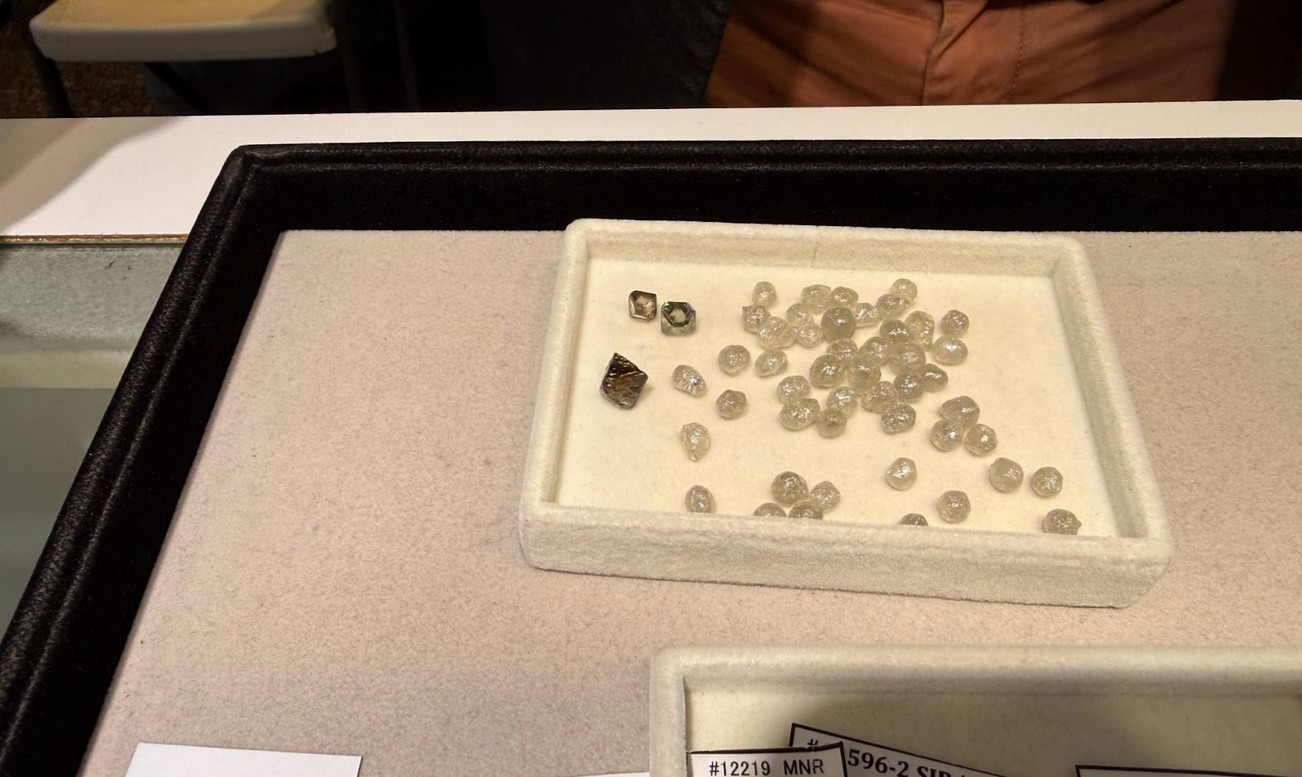Part of Dynamic International's collection of asteroid diamonds. The flat diamond at the top left of the display is called a "macle," which is a twinned crystal that formed when part of the expanding crystal grew in a different orientation. You can see that its graphite clouds are still perfectly aligned with the growth plane. Photo by Emily Frontiere.