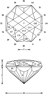 Addition # 8 - Cut this in refractive indexes 1.54 to 2.14 (89.5%) with no changes. The crown on this is a little complicated, and I do not recommend this for a novice. The crown can be cut in another order and may take some adjusting to make all the meets depending on your faceting machine. This is really nice in higher refractive index materials like Zircon and Sapphire.