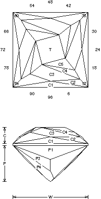 Detailed information and guide on Faceting Designs. Faceting Design Diagram by Jeff R. Graham that presents various cuts, this one is called "Dagger Bottom"