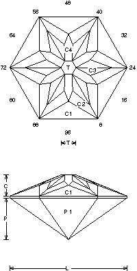 Addition # 9 - Do not bother cutting a table on small stones (under 10mm). A table is helpful on large stones. Cut in refractive indexes 1.62 to 2.14 with no changes. This design is very interesting in Zircon, particularly light colored ones. Also try it in Garnets.