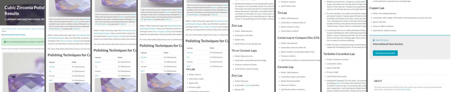 Editor’s Note: Some years ago, the International Gem Society (IGS) conducted a survey of members’ polishing techniques. Here, you’ll find the results for cubic zirconia polishing. Whether you’re just starting to learn the art of gem cutting or just looking for a new way to tackle a problematic gem material, we hope these results provide some useful suggestions.