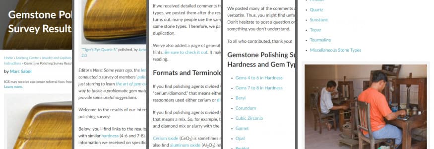 Editor’s Note: Some years ago, the International Gem Society (IGS) conducted a survey of members’ polishing techniques. Whether you’re just starting to learn the art of gem cutting or just looking for a new way to tackle a problematic gem material, we hope these results provide some useful suggestions.