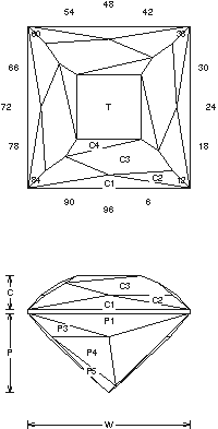 Successful tips and guide on Faceting Designs. A Faceting Design Diagram by Jeff R. Graham that presents various cuts, this one is called "Harlequin Square"