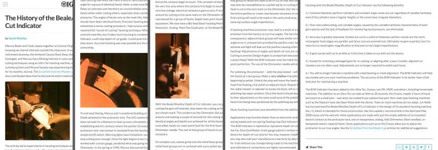 The articles led to experiments in faceting techniques and in fine-tuning machines. Our machines are mast type faceting machines, each with a lock or hard stop designed to end the cutting at precisely the same angle for a group of identical facets. Note: a mast must flex when a protractor lock is engaged. A mast flexes an unknown and therefore an uncontrollable amount from facet to facet, thus over cutting…