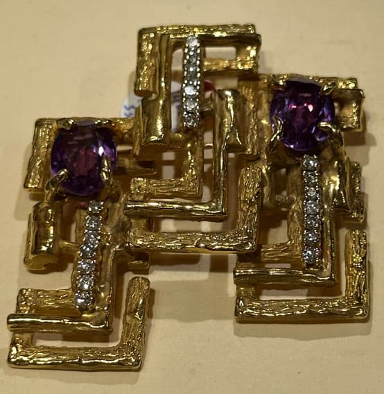 Fortunately, I found a second dealer, Julia Rover of Roy Rover Antiques, who had in her possession a brooch with not one, but two, big synthetic color change sapphires.