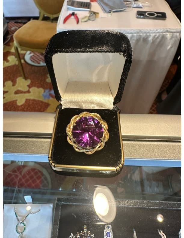 Each year, an exclusive show featuring vintage and antique jewelry is held in Las Vegas. This year, I encountered several dealers who had synthetic color change sapphire jewelry for sale. The first piece that I encountered was a ring featuring a single, massive, synthetic color change sapphire.