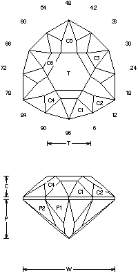 Addition # 7 - I designed this for a nice size yellow/green Mali Garnet. This is very deep to help color and dispersion. Notice the facets are smaller and they cross each other to help increase sparkle. This works well in man-made Sapphire, Zircon, and CZ with no changes.