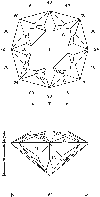 Addition # 3 - This design cuts a little different than usual. It is not hard, watch the step on the crown. I like this in a large Amethyst (in darker color). Cut in about any material, 1-12cts. Cut in refractive indexes 1.54 to 2.14 (88.2%) with no changes.