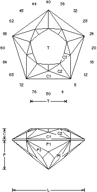 Successful tips,details and guide on Faceting Designs. Faceting Design Diagram by Jeff R. Graham that presents various cuts, this one is called "Pent Split"