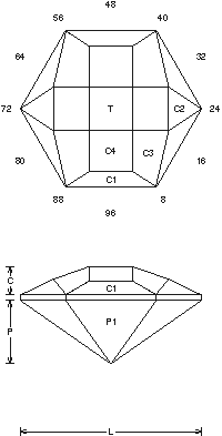 Addition # 6 - This was designed for a rather large piece of Nigerian Tourmaline that I wanted to cut. The stone was six-sided with Rubellite outside with a peach center. I wanted something that would be bright and show off the unusual quality of the rough. I prefer checkerboards for material that is saturated and here is what I came up with. This works well in Garnet, darker Sapphire and most man-made materials.
