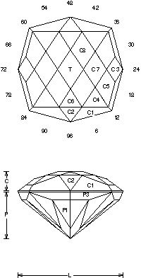 Detailed information and guide on Faceting Designs. A Faceting Design Diagram by Jeff R. Graham that presents various cuts, this one is called "Royal Mine".