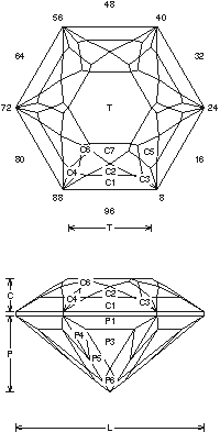 Addition # 1 - This design is tough to cut because of the step cuts, and the small C6 facets (have to be exact) on the crown. This design is good for very light colored materials, notice it is not bright, but it has a lot of sparkle. Cut in refractive indexes 1.54 to 2.20 with no changes.