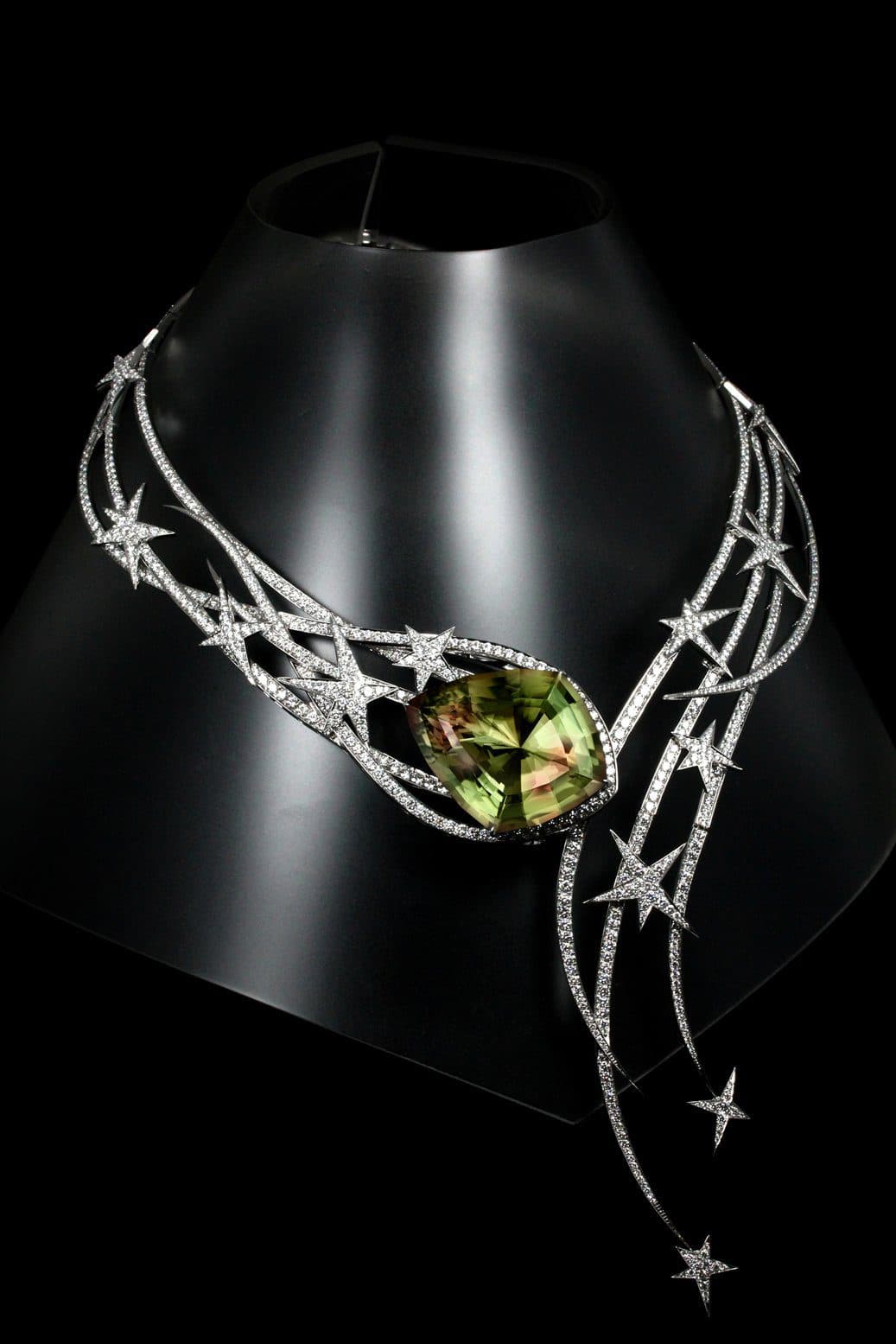 Sometime afterwards, after I returned the stone to Murat and quite sometime latter, it along with one matched pair of pear shapes and an large oval were given to Stephen Webster of London for the creation of a jewelry ensemble with the 96 carat Sultans Shield Zultanite® as the main attraction in a "Shooting Star" motif necklace, along with a matched pair of earrings and a fabulous ring in the same motif (you can view them in the link at the end of this report below) of which the Zultanite's in the ring and earrings where "not" faceted by me but I believe they where stones faceted by Rudi & Ralph Wobito of Canada, who where also involved with many faceted Zultanite® stones coming from them and their very fancy and clever "Snow Flake" cut, a part faceted and carved designed stone resembling a snow flake. This ensemble is valued at over $1.5 million dollars with the 96 carat Sultans Shield Zultanite® coming in at over a cool $1 million dollars just for the stone I faceted, though I did not know at the time it would become so valuable.