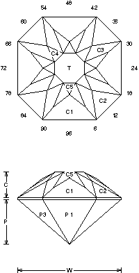 Addition # 9 - Note: The C3 tier only meets at the corners, it is center point. Cut it as evenly as you can, you may need to tweak it. This is very lively and nice in about any saturation. I like it in light pink Tourmaline like the Afghan pastel nodules that are sometimes available. The design is deep enough that it will not wash out pale color. Cut in refractive indexes 1.62 to 1.76 with no changes.