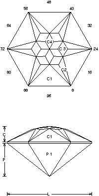Addition # 9 - This works best in light colors. Cut in refractive indexes 1.54 to 1.76 with no changes. I designed this for 10mm earrings and it is quite striking in Rose de France. On a very large stone a table can be cut to meet C4. This makes a very interesting stone.