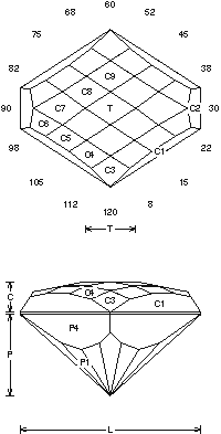 Detailed information and guide on Faceting Designs. Faceting Design Diagram by Jeff R. Graham that presents various cuts, this one is called "Diamond Star".