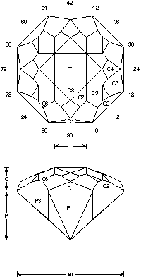 Addition # 8 - This is a nice one, cut it in about any colored material. It is a little different and the crown, while not hard to cut, can be confusing for a novice. Cut this in refractive indexes 1.54 to 2.14 with no changes. I like this in pink Tourmaline. It is ideal for medium to light colored material. This design has very interesting flash patterns.