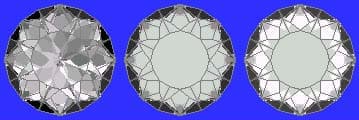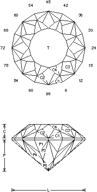 Gram Book 1 - This design is good for a large stone 1-20cts, in light to medium material. It is not hard to cut, and it has a lot of sparkle. The star in the point of the Pavilion makes the table lively. Cut in refractive index 1.62 to 2.14 (89.5%) with no changes.