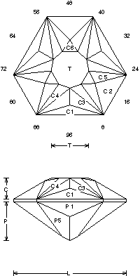 Successful tips, details and guide on Faceting Designs. A Faceting Design Diagram by Jeff R. Graham that presents various cuts, this one is called "Twinkle"