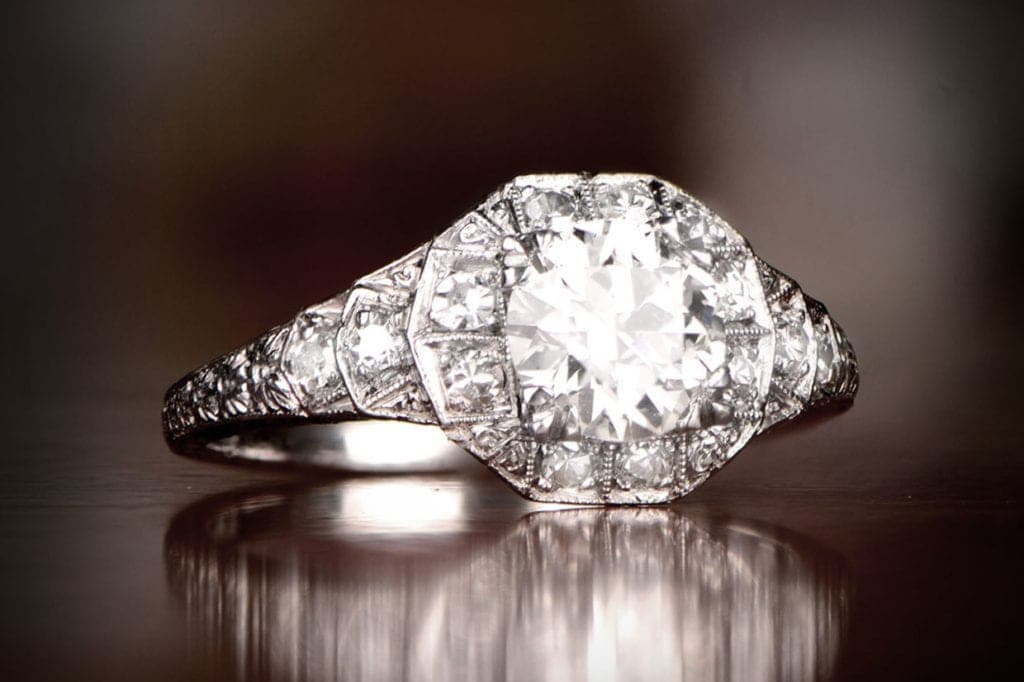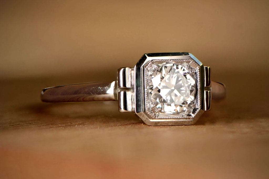 In contrast to the lacy lightness of Edwardian styles, Art Deco was all about bold geometry and repeating patterns. Instead of curvy, flowing filigree, Art Deco rings often included metalwork with repeating, sharp angles and tiny beads called milgrain. This style has enjoyed a resurgence in popularity in recent years.
