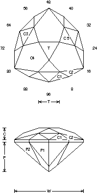 Addition # 7 - This is not meant to be a large stone. I usually do not cut it larger than 2 to 3 carats. This design will help lighten up material that is just a little on the dark side. The large triangular shape on the crown reads well from a distance and is interesting. Cut in refractive indexes 1.62 to 2.20 with no changes.