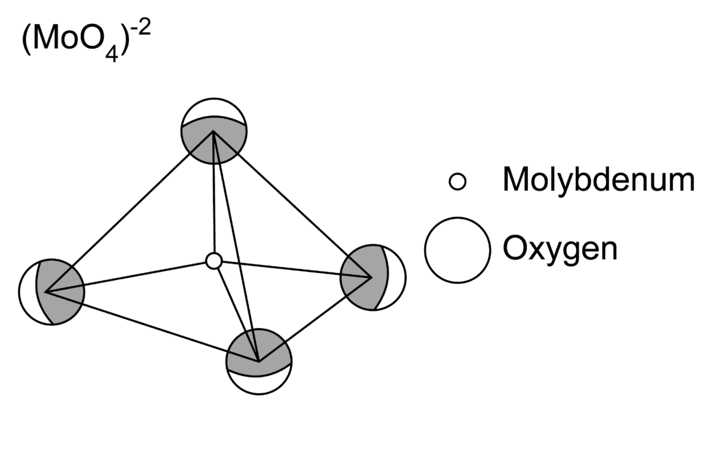 Wolframate (also called tungstate) and molybdate classes are also usually studied together because of their similar crystal structure and mutual geological occurrence. Oxyanions are (WO4)2- for wolframates and (MoO4)2- for molybdates and occur in tetrahedral coordination (except for wolframite, which occurs with octahedral coordination). However, compared to the previous group, these oxyanion tetrahedrons are flattened because W6+ and Mo6+ ions are bigger than P5+. The most common cations are Са, Fe, Cu, Pb, and Mn.