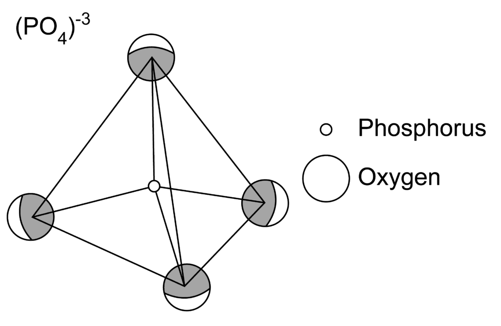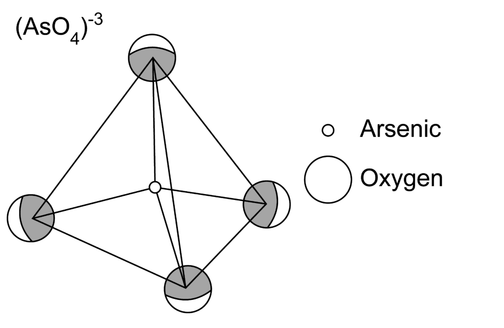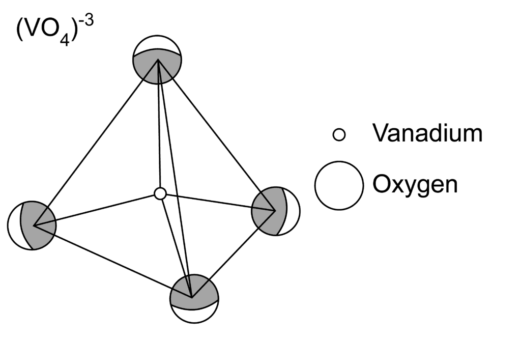 Phosphates, arsenates, and vanadates are mineral classes with complex anions of (PO4)3-, (AsO4)3-, and (VO4)3-, respectively. Anion complexes occur in tetrahedral coordination, meaning each atom of phosphorus, arsenic, and vanadium is surrounded by four oxygen atoms.