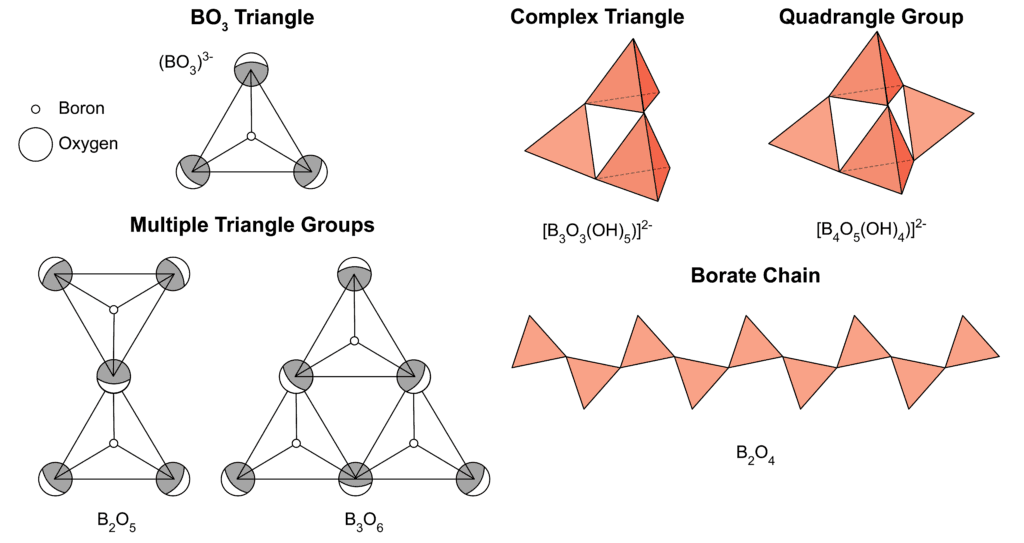 Borate minerals also have a simple triangular oxyanion (BO3)3-. However, this oxyanion can polymerize, linking the (BO3)3- complexes into extended units such as double triangles, triple rings, sheets, and chains. Cations are mostly Mg, Na, and Ca.