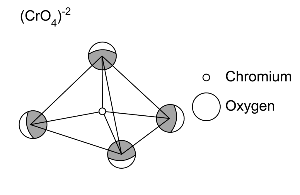 There are only 15 mineral species in the chromate class. Chromate's oxyanion is (CrO4)2- in a tetrahedral coordination. The most common cations are Pb, Сu, Zn, Ca, K, Na, and Ba. The most well-known chromate is crocoite (PbCrO4). Although crocoite has no economic significance, mineral collectors value it very highly.