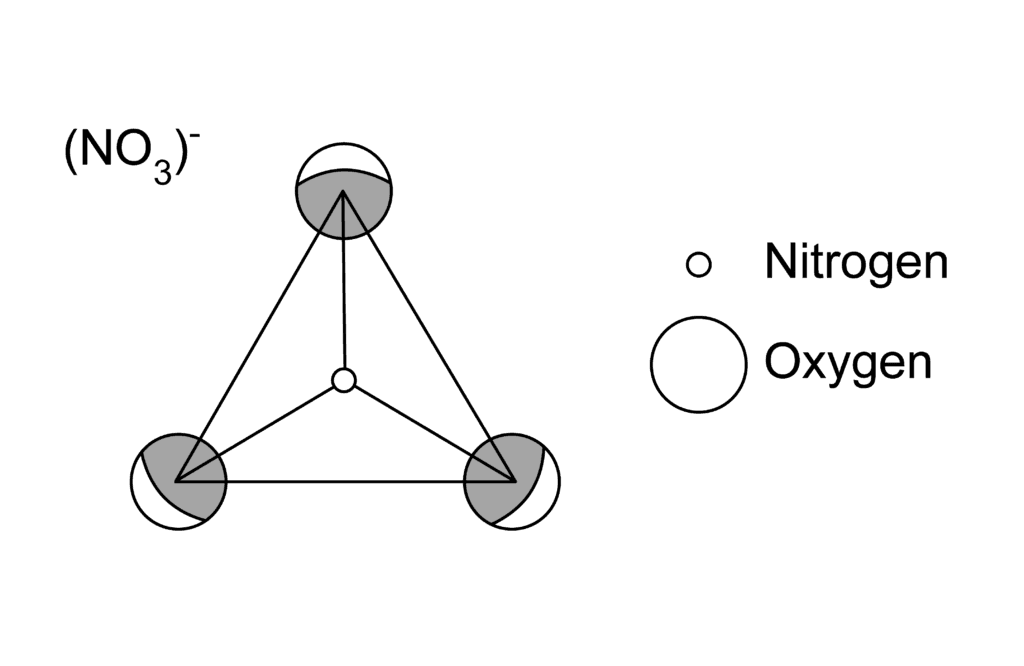 Nitrate structure is characterized by a planar triangular anion (NO3)- similar to the (CO3)2- of carbonates. However, the forces between N and O are stronger, so nitrates are harder to dissolve in acids. Cations are mainly represented by Na and K. There are only eight known nitrate minerals, all of them very rare.