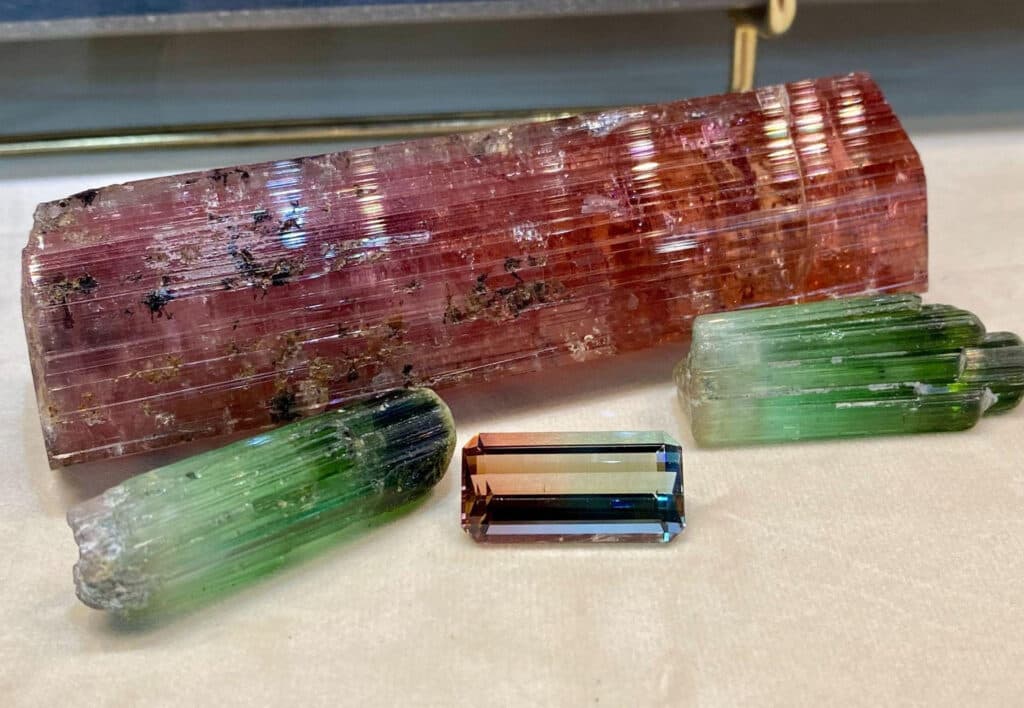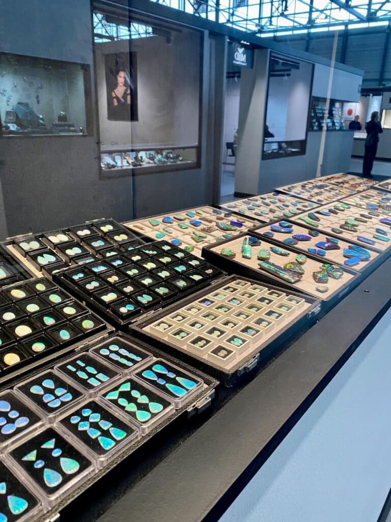 Aquamarines, morganites, and tourmalines of any color are available in top quality of any size and cut. Some dealers emphasize natural forms and present rough crystals with faceted ones. There were several opal dealers with mindblowing opal samples.
