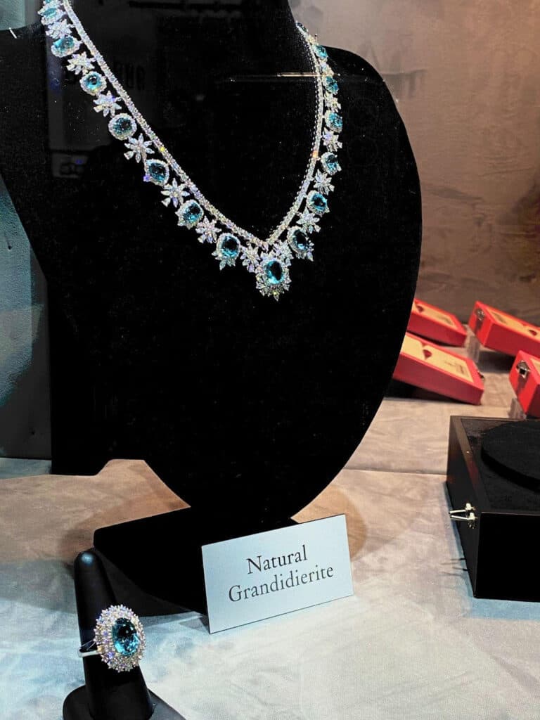Some surprising findings of the show include this necklace and a matching ring with grandidierite. This rare borosilicate mineral is commonly found in translucent rav crystals, limiting the production of faceted gemstones.
