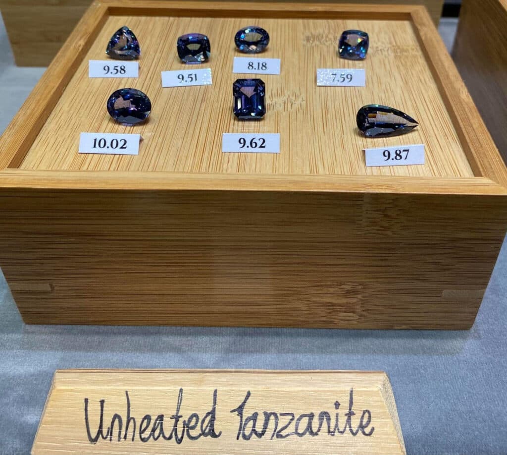 Another remarkable finding was unheated faceted tanzanite of exceptional quality. As you can see, the stones don't have a saturated violet-blue color as we used to see; however, it has a stormy-gray undertone making them exceptional and having this mystique gray-blue allure.