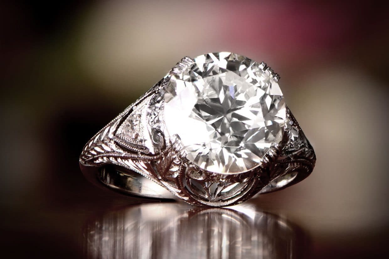 Edwardian-era engagement ring with a 4.30-ct antique cushion-cut diamond center stone set in platinum, circa 1910. The openwork filigree on the sides of the ring has a leaf motif. Photo © Estate Diamond Jewelry. Used with permission.