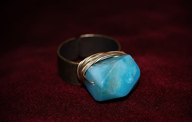 Peruvian opal wire-wrapped ring with brass band. Photo by Zoe. Licensed under CC By 2.0.
