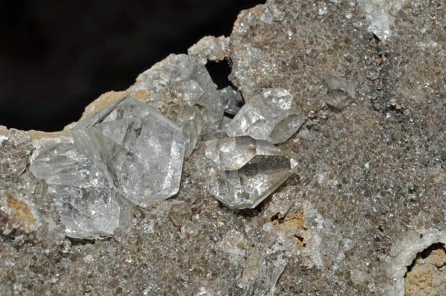 "Herkimer diamonds" are actually clear, double-terminated quartz crystals found in Herkimer County, New York. "Crystals of quartz var. Herkimer," Middleville, Town of Newport, Herkimer Co., New York, USA, by Géry Parent is licensed under CC By-ND 2.0