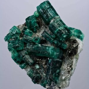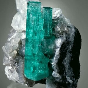 Colombian emerald on calcite. © Rob Lavinsky, www.iRocks.com. Used with permission.