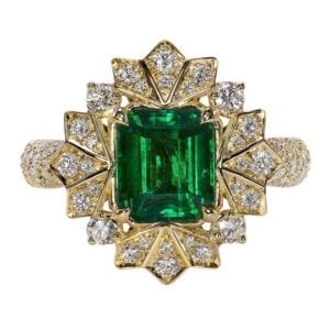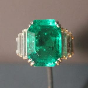 With large and gleaming baguette-cut diamonds on either side, the Maximilian Emerald ring would stand out on any finger. Photo by Cliff. Licensed…
