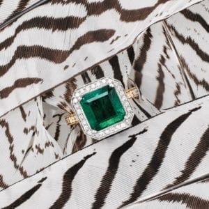 A 3.08-ct emerald and diamond side stones make this Tiffany ring a real head-turner. © Jogani Beverly Hills. Used with permission.
