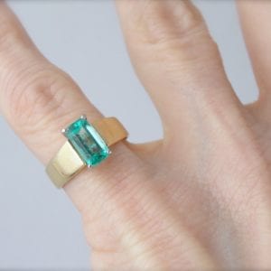 Elongated emeralds like the one in this ring look great with thick bands. © Market Square Jewelers. Used with permission.